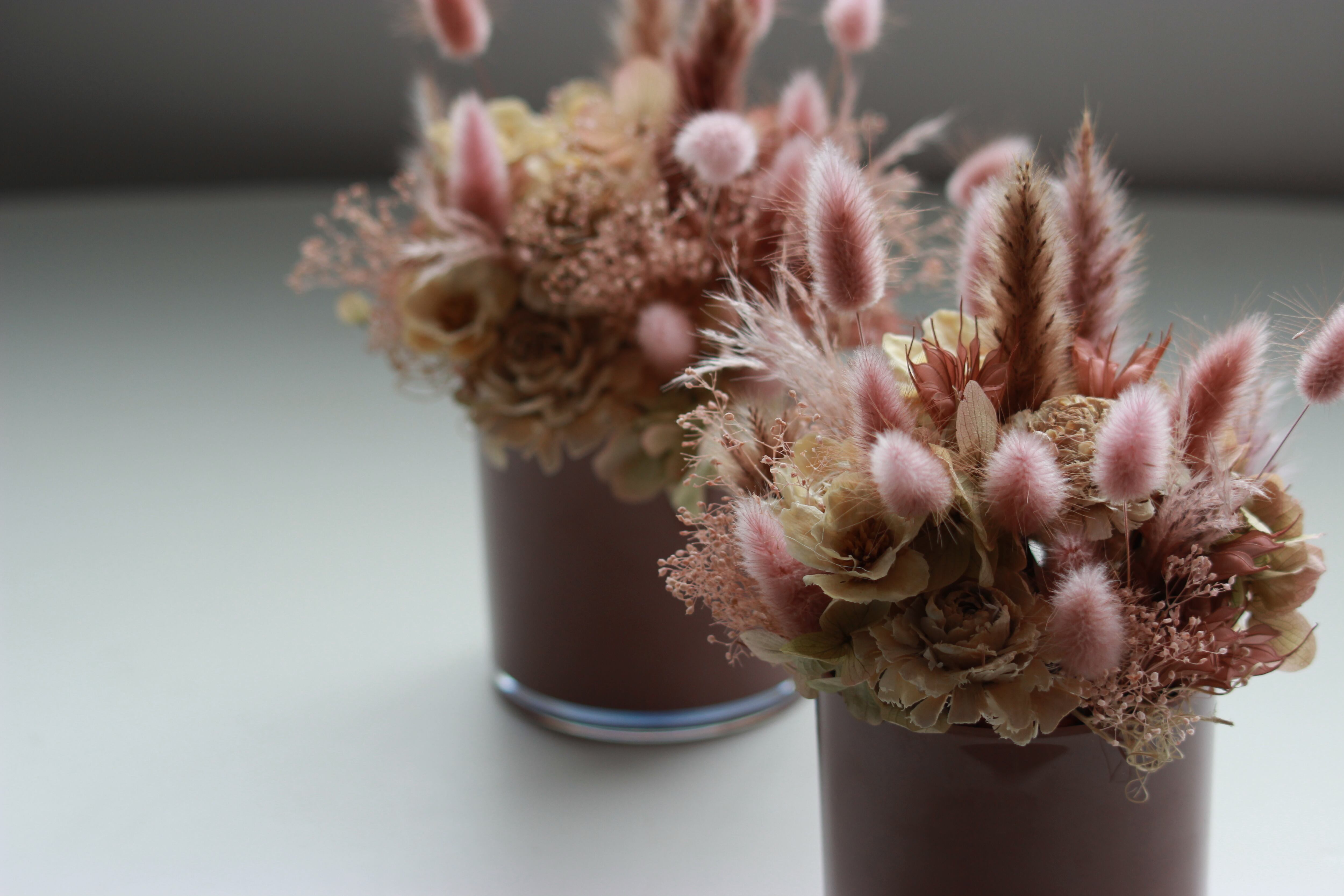 プリザーブドフラワーと、ドライフラワーを使用したアレンジメントです